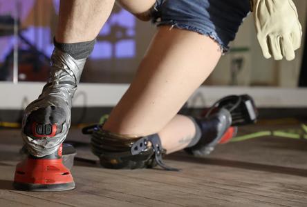 I Have Some Boundaries /J'ai des limites>> wearing orbital palm sanders as shoes Johnny Forever sands a portion of an old hardwood floor into a heart icon while taking on the various bodily contortions necessitated by the action. Performed as part of Suoni per il Popolo, Tiohtià:ke/Montréal.