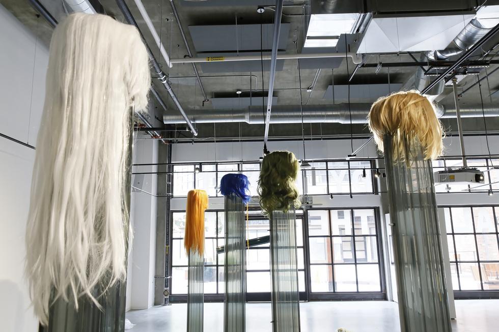 Karyatides >> This work is a queer comedic take on the ancient geek temple columns that took the form of femme-coded bodies. The series of sculptures is constructed from cheap wigs and ubiquitous polycarbonate roofing panel to playfully reconstruct . The Karyatides also appear in digital form, populating collages and videos in various ways.